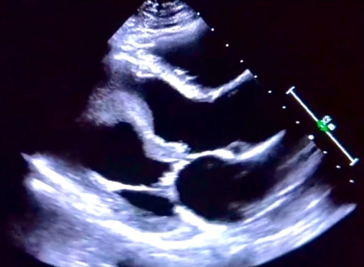 The formation of apical ventricular thrombi is commonly seen following acute myocardial infarctions as damaged tissue is exposed to the blood; fibrin, red blood cells, and platelets coagulate in the area of stagnant flow as a result. Multiple images below explore this large pedunculated thrombus and its mobile nature within the left ventricular outflow tract.